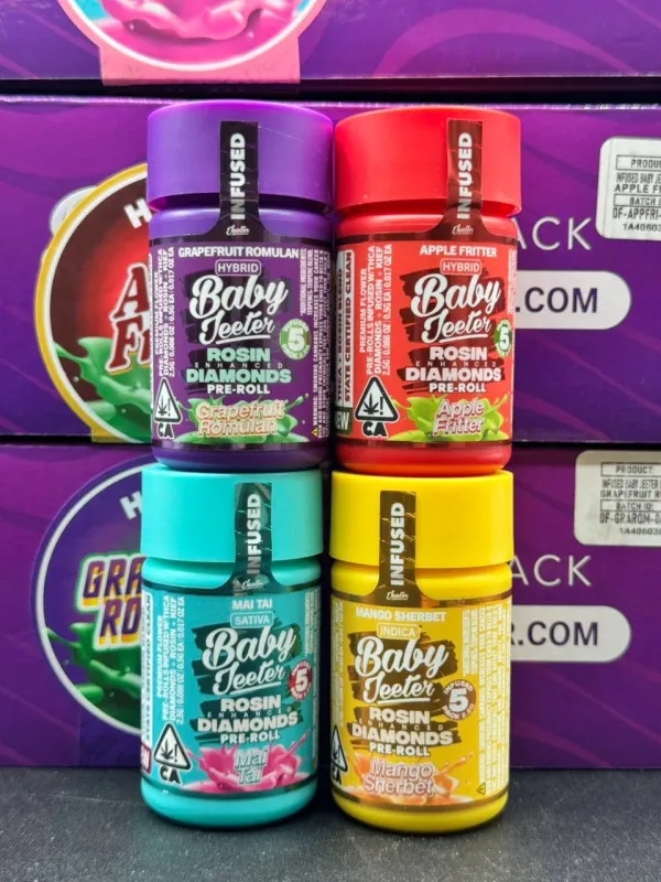 Enjoy a premium cannabis experience—bold, refined, and ready to elevate your next session with Baby Jeeter Rosin Diamond Pre‑Rolls: Peaches | Pina Colada | Cherry Blossom.